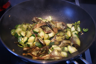 2. Cuando el ajo empiece a dorarse añadimos el pimiento verde cortado en rodajitas y el calabacín en dados. Seguidamente limpiamos y cortamos las alcachofas y las echamos.