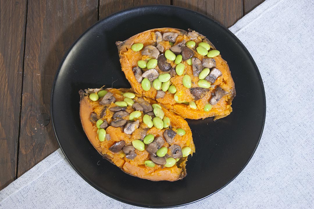 6. Sacamos la carne del boniato asado con ayuda de una cuchara y la echamos en otro recipiente. Mezclamos esta carne de boniato con algo más de la mitad de los edamames y champiñones. Rellenamos con esta mezcla los boniatos.