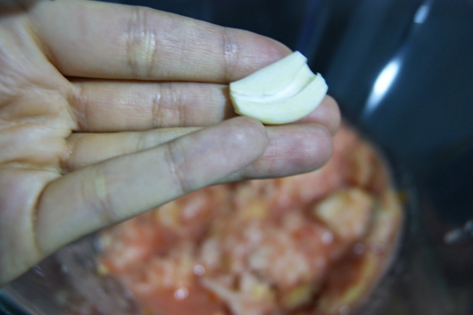 3. A continuación, incorporamos el ajo, quitándole la parte central para que no repita, y trituramos bien con la batidora, hasta obtener una crema espesa. También echamos la sal y, si queremos, un poco de vinagre de jerez.