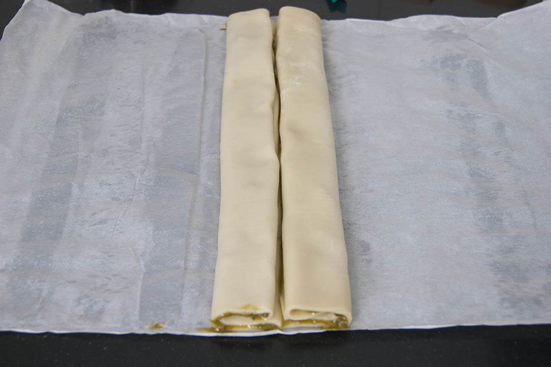 2. Después de esto, extendemos la plancha de hojaldre y la cubrimos toda con una capa fina de pesto.