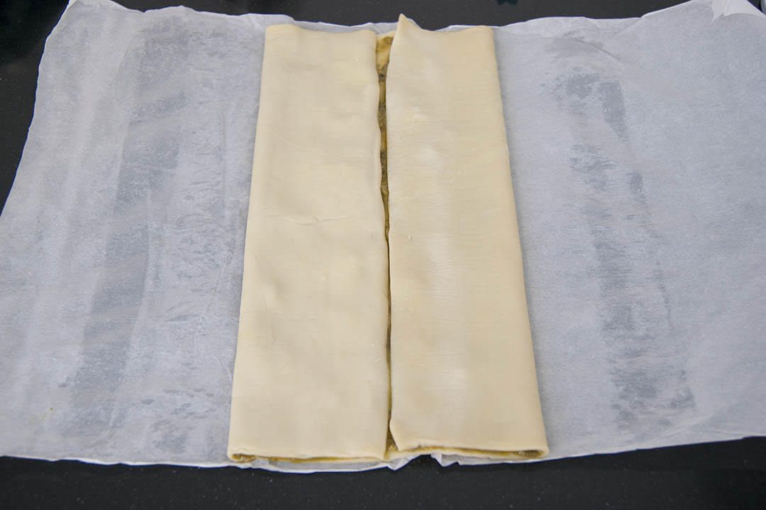 4. Ahora toca doblar el hojaldre tal cual veis en las fotos. Primero los extremos hacia el punto central (foto 1) y luego otro pliegue de nuevo hacia el centro (foto 2). Y juntamos ambas partes para que nos quede un «rollo» así como con forma de corazón.